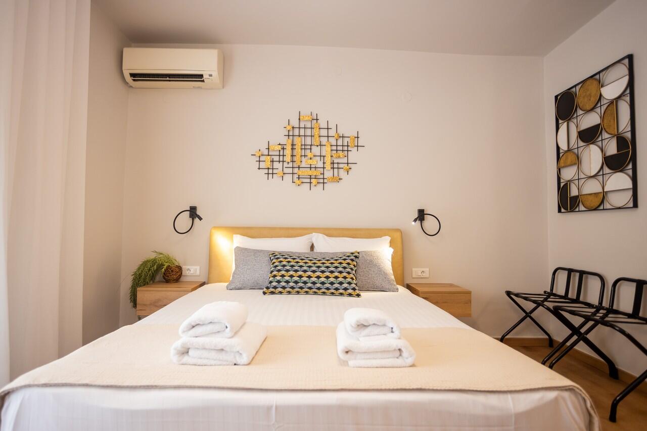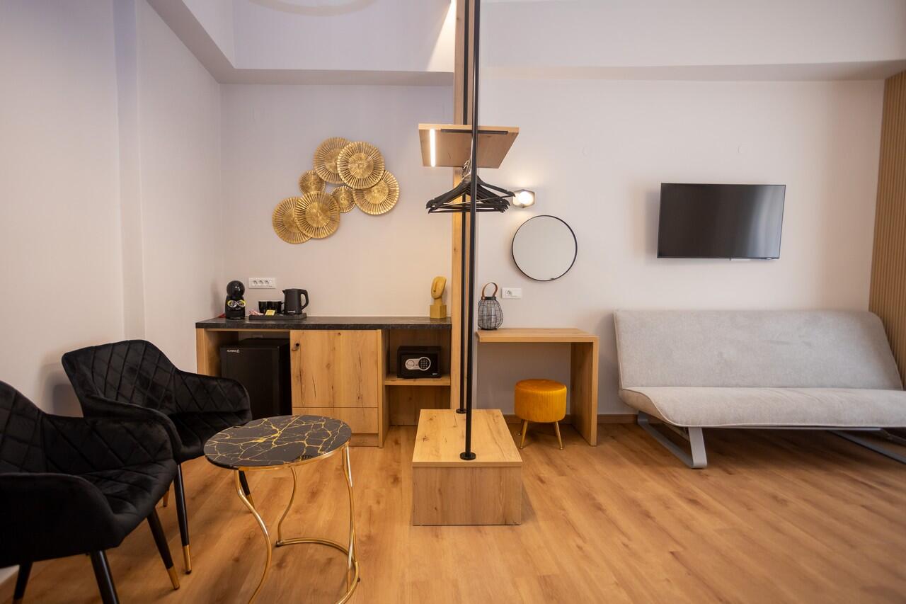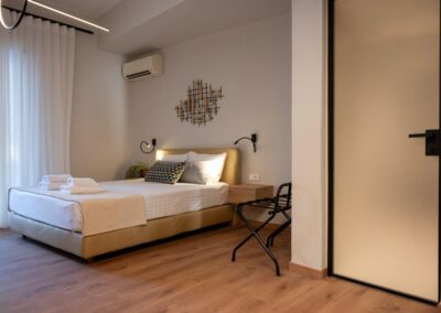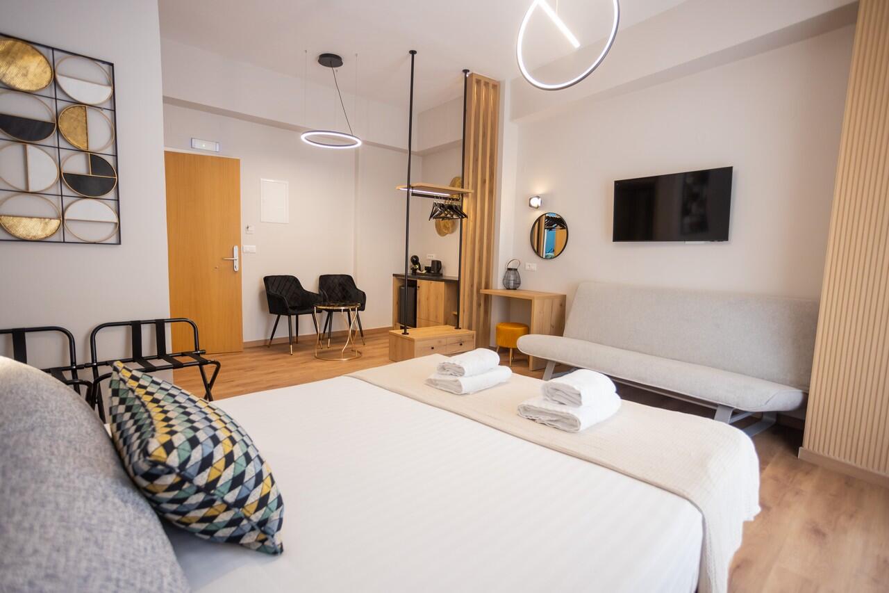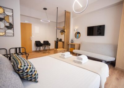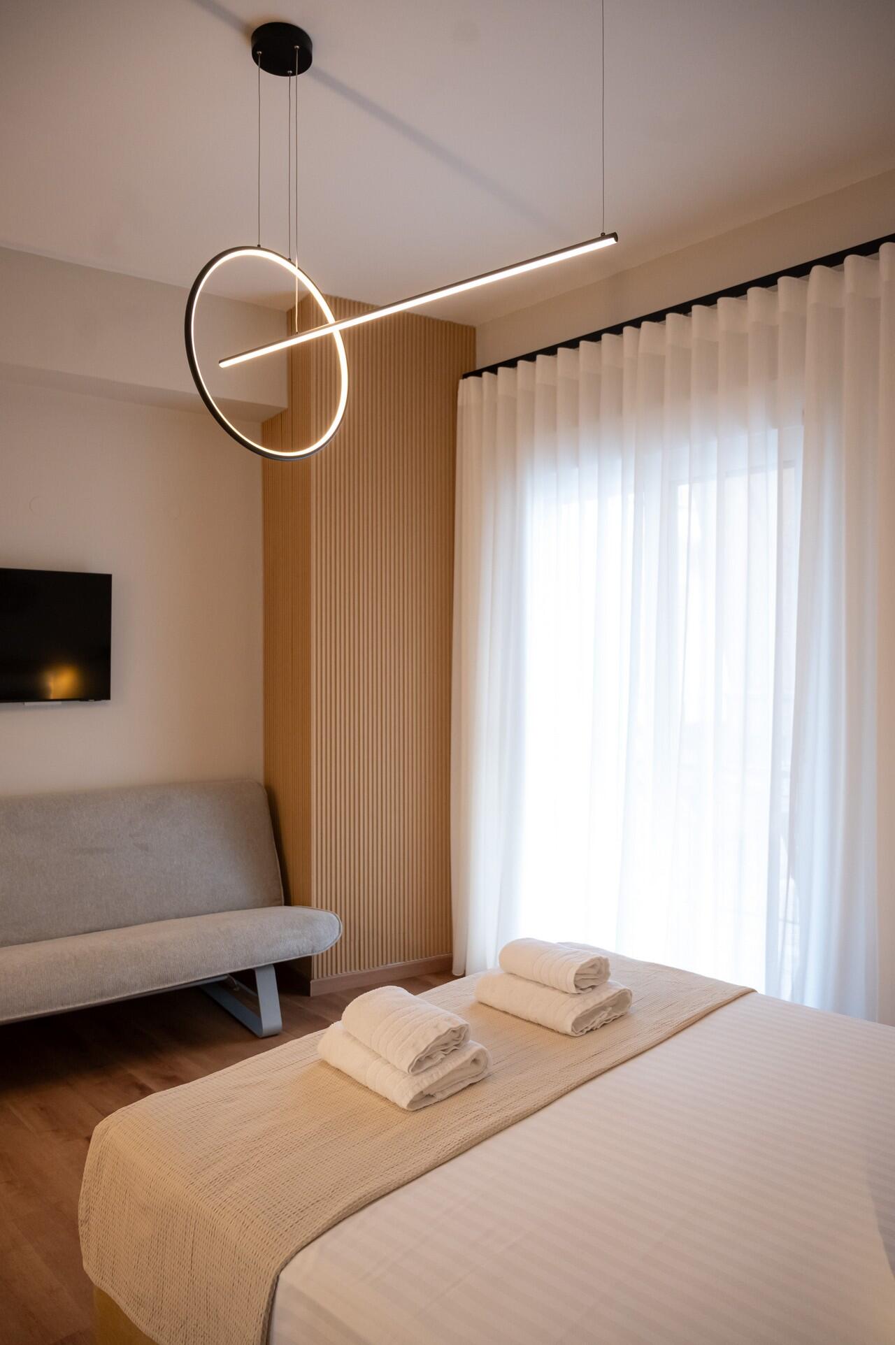 Superior Δωμάτιο 1 Διαθέτει: 1 πολύ μεγάλο διπλό κρεβάτι & 1 καναπέ κρεβάτι Μπορεί να φιλοξενήσει εως 3 ενήλικες ή 2 ενήλικες και 2 παιδιά 35 Τ.Μ. Κράτηση